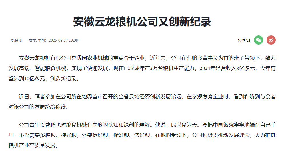 • 2025-08-29 中國(guó)工業(yè)新聞網(wǎng):安徽云龍糧機(jī)公司又創(chuàng)新紀(jì)錄